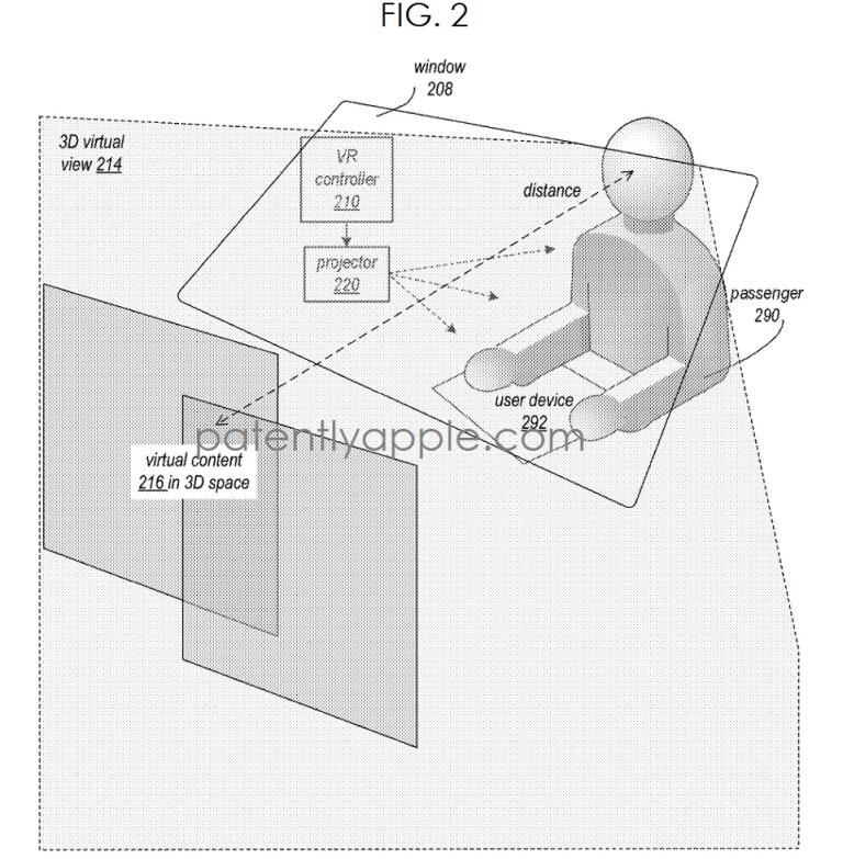 ▲苹果专利图2显示了将VR内容投影到车辆窗户以供乘客观看的VR驾乘系统示例