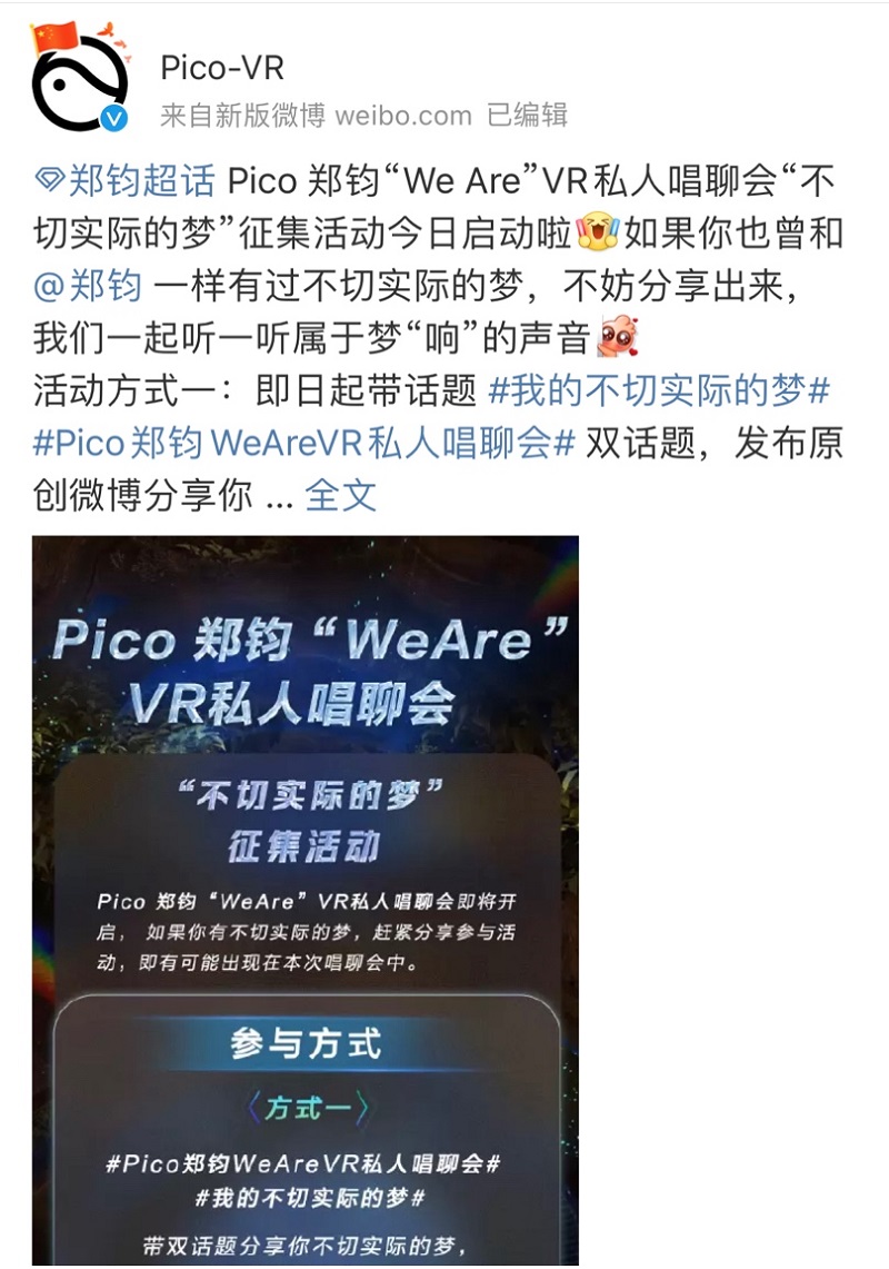 不仅如此,本场唱聊会将改变传统演唱会“我唱你听”的观演方式,打造一次全新的星际“树洞”唱聊空间,弹幕互动贯穿全程。在唱聊会中,郑钧将讲述自身故事,观众也可以通过弹幕分享出自己的故事,与郑钧进行一次双向交互治愈对话,真正做到VR唱聊与我有关。而在此前,Pico官方微博也发起了“我的不切实际的梦”活动,收集网友、用户的有关回答,其中的部分回答将有机会出现在唱聊会现场,被郑钧看到和分享。