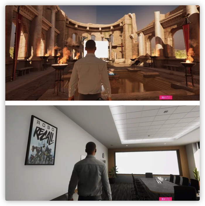而在会议空间方面,「Detroit Lab」提供了古罗马、现代办公和湿地三大主题空间,每个虚拟空间都布置有长桌和屏风,从而将虚拟会议与环境完美结合。