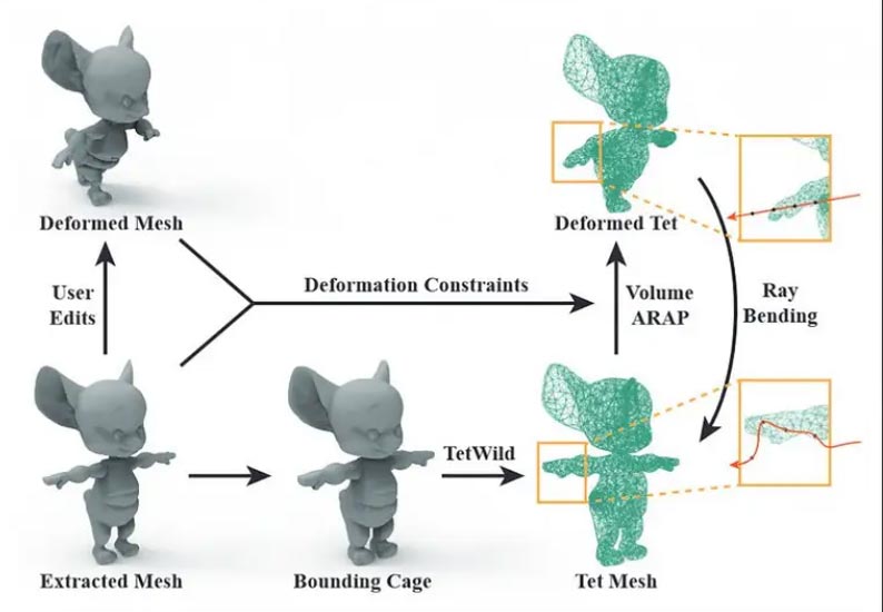 研究人员在提取的目标场景的显式网格表示和隐式神经表示之间建立了对应关系。用户可以首先利用发展良好的基于网格的变形方法来变形场景的网格表示。然后,NeRF-Editing利用来自网格表示的用户编辑,并通过引入四面体网格作为代理来弯曲camera光线,从而获得编辑场景的渲染结果。