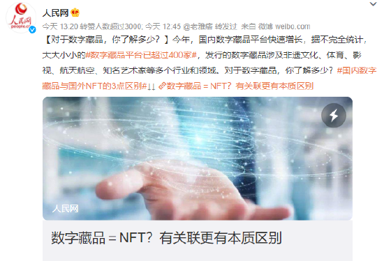 今日,人民网官方微博发布了一篇名为《数字藏品=NFT?有关联更有本质区别》的文章,具体谈到了国内数字藏品与国外NFT的3点区别,以及未来数字藏品的发展。