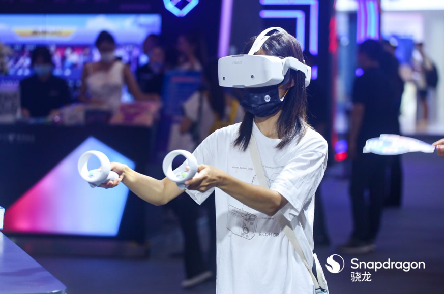 在骁龙硬核探秘馆,观众可亲自体验跨品类、跨行业的顶级潮流科技新品,包括全新骁龙8+智能手机、TWS无线耳机、Wi-Fi路由器、电动汽车等,而且还可以通过戴上VR眼镜瞬间进入一场极具沉浸感的VR大片或者游戏中。