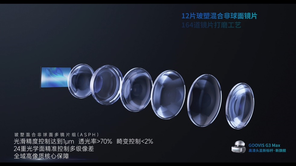在创始人彭华军看来,GOOVIS本质上是一台高精密的光学设备。 GOOVIS的光学可以将微型屏上所有信息近乎100%等比例放大至巨幕,且做到边缘画质清晰,如此优秀精湛的显示效果,得益于独家研发的光学方案——玻塑混合非球面多镜片组ASPH。