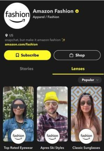 新的虚拟穿戴 AR 滤镜包含数千种亚马逊时尚流行的虚拟试戴眼镜产品,使亚马逊品牌能够利用其亚马逊 AR 资产,并以有趣的互动体验向数百万 Snapchat 用户展示风格。客户将能够直接在 Snapchat 上探索、购买和数字试戴数千种眼镜款式,然后在亚马逊时尚商店无缝购买。
