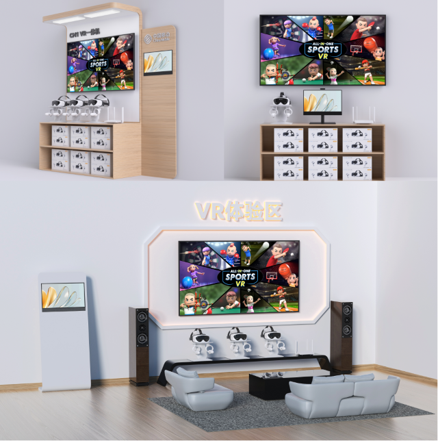 在实际布展中,移动云VR体验系统布置位置灵活,占地面积小,可根据各营业厅的实际空间进行3平米——10平米不同的部署设计。