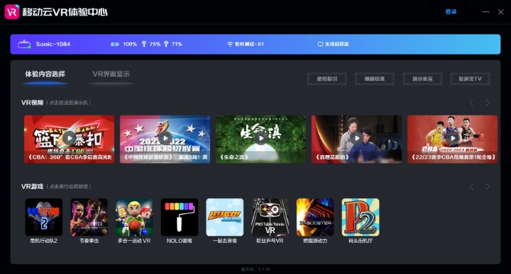 移动云VR体验系统终端包含触控主机和 VR一体机。其中触控主机交互界面明晰简约、操作简单,采用手指触控屏幕操作,可实时控制已连接的 VR一体机实现对应功能,如校准画面、下载开启游戏、内容投屏等。VR一体机在中控平台控制下,用户可实现几乎0操作即可流畅体验云VR视频、VR游戏等内容。除此之外,在一体机被中台控制的前提下,用户依然具备自主使用设备的按键功能。