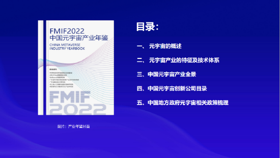 FMIF2022 组委会联合ARinChina、WellsennXR、西安邮电大学数字文化产业研究院、广东省数创技术研究院、西工大长三角人工智能与虚拟现实研究院、广东省MR混合现实教育产业技术创新联盟等机构,共同发布了《FMIF2022中国元宇宙产业年鉴》;大会开场由FMIF2022未来元宇宙创新论坛秘书长、ARinChina创始人张明军先生对产业年鉴内容发布进行了汇报。该年鉴从: 元宇宙的概述、元宇宙产业的特征及技术体系、中国元宇宙产业全景、中国元宇宙创新公司目录、中国地方政府元宇宙相关政策梳理等五大方向着重对中国的元宇宙产业进行系统梳理,年鉴内容超过14万字。据介绍该年鉴核心以国内产业分布、创新企业收录为主,是目前介绍中国元宇宙创新企业最为全面的行业分析资料。同时该研究资料也将会在年底翻译成英文、韩文版本,充分加强中国元宇宙产业与海外的交流。