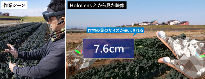 力丸农场需要为学校和酒店等提供蔬菜,而测量和分类作业十分重要。力丸敦夫解释道:“在收获蔬菜时,我们会用事先测量好尺寸的棒子来代替尺子。但习惯了之后,工作人员会凭直觉直接收获,所以品质会产生偏差。如果是HoloLens 2的AR测量,你就可以正确地测量菜叶的厚度和长度,并直接进行收获分类作业。”