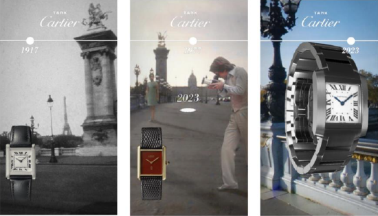 卡地亚 Tank 手表体验使用 AR 滤镜将用户运送到巴黎的亚历山大三世桥。虚拟体验可让用户看到过去 106 年不同时期的四次手表迭代,然后还能环顾桥上的行人,感受那个时代的气息。