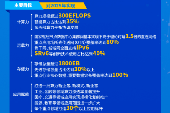 计划中还提到,目标到2025 年,计算力、运载力、存储力,及应用赋能都将进入新的台阶。