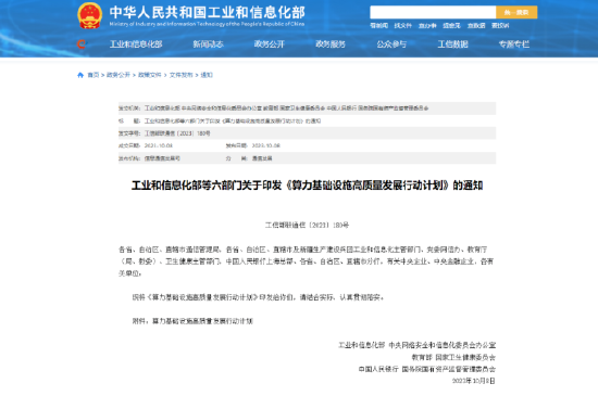 2023年10月8日,工业和信息化部等六部门印发《算力基础设施高质量发展行动计划》。