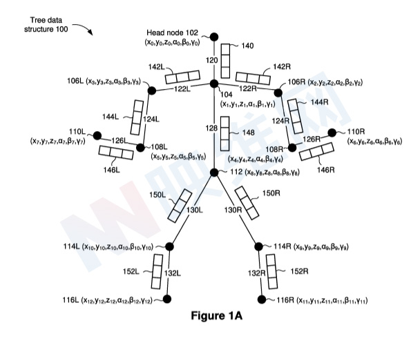 在各种实现中,树数据结构100的每个节点与位置和方向相关联。所以,每个节点与一组位置坐标(例如x、y和z)和一组角度坐标(例如α、β和γ)相关联。例如,头部节点102与一组位置坐标(x.sub.0、y.sub.0、z.sub.0)和一组角度坐标(.alpha..sub.0、.beta..sub.0、.gamma..sub.0)相关联。
