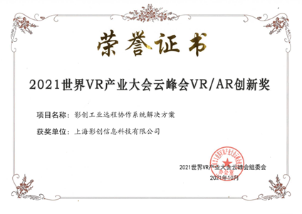 在本届2021世界VR产业大会上,影创工业远程协作系统解决方案荣获2021世界VR产业大会云峰会VR/AR创新奖。