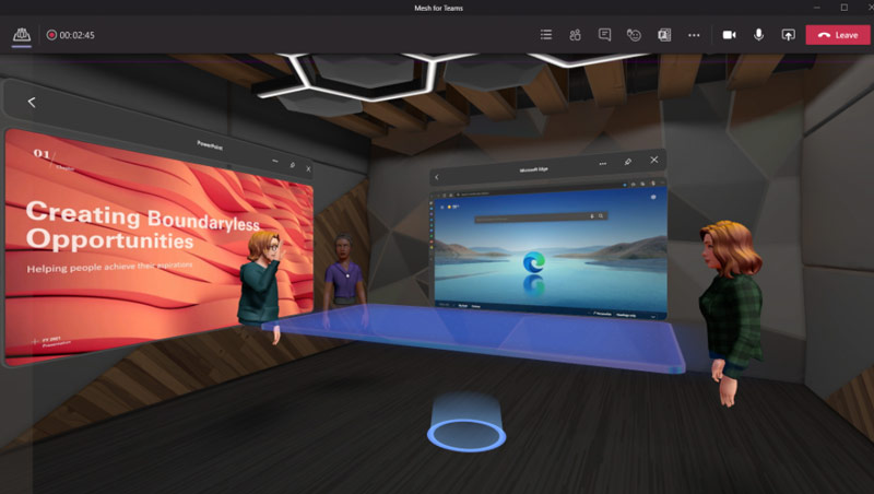 这个工具旨在将Microsoft Mesh的混合现实功能与Microsoft Teams的生产工具相结合。其中,Microsoft Mesh允许不同物理位置的用户加入协作和共享全息体验,而对于Microsoft Teams,用户可以加入虚拟会议、发送聊天、协作共享文档等等。