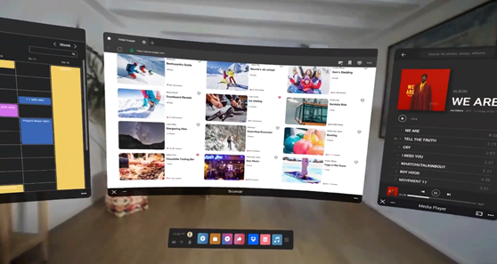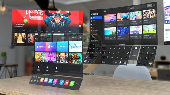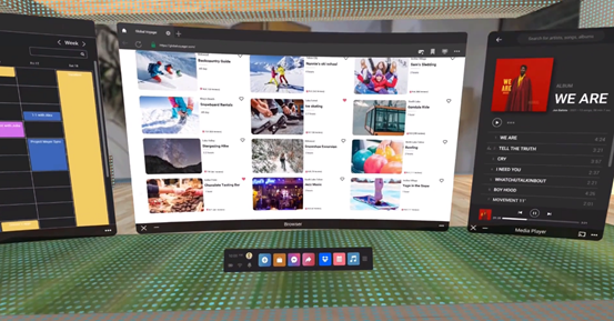就在今年夏天,我们对外预告了新系统Tesseract OS,并推出了体验版,邀请众多开发者与用户体验。Tesseract OS采用了多任务窗口,采用全新Dock栏,弧形大屏等新风格,与Meta所公布的多任务3D屏幕再一次不谋而合。另外我们还加入ASW、PTW等众多渲染技术上的升级,降低延迟和眩晕,提升用户体验。
