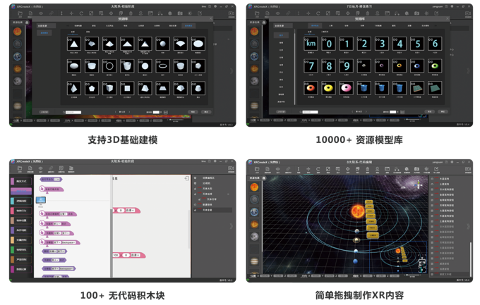 公司自主研发的CreateX XR内容制作工具,可以帮助老师在实施教学过程中,制作VR课件以及作品,实时追踪学习效果,可同步提升课堂教学层次,丰富教学成果,分享可实现区域教育教学水平提升;内置万级+资源模型库,支持基础3D建模,在模型资源库和角色选择上给予最大的选择自由度;创作者无需懂代码, 拖拽、拼装轻松制作XR内容,老师可灵活制作课件辅助教学,让学生沉浸式VR课程知识点讲述,多源驱动性高效学习,极大提高学生的学习兴趣和老师的教学质量;XR内容创作的内容,可分享到 2B/2C平台上变现,实现亿级用户教育市场的XR知识付费;