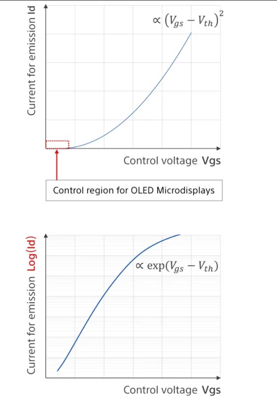 纵轴显示电流,横轴显示控制电压。在智能手机OLED的TFTs中,电流控制在由控制电压和晶体管阈值电压的平方所定义的区域内,但对于Micro-OLED显示器,其需要使用常规CMOS逻辑控制由指数函数定义的微电流区域。在所述区域,即使是电压的微小变化都会导致电流量呈指数级增加或减少。所以,每个像素的亮度变化很大。