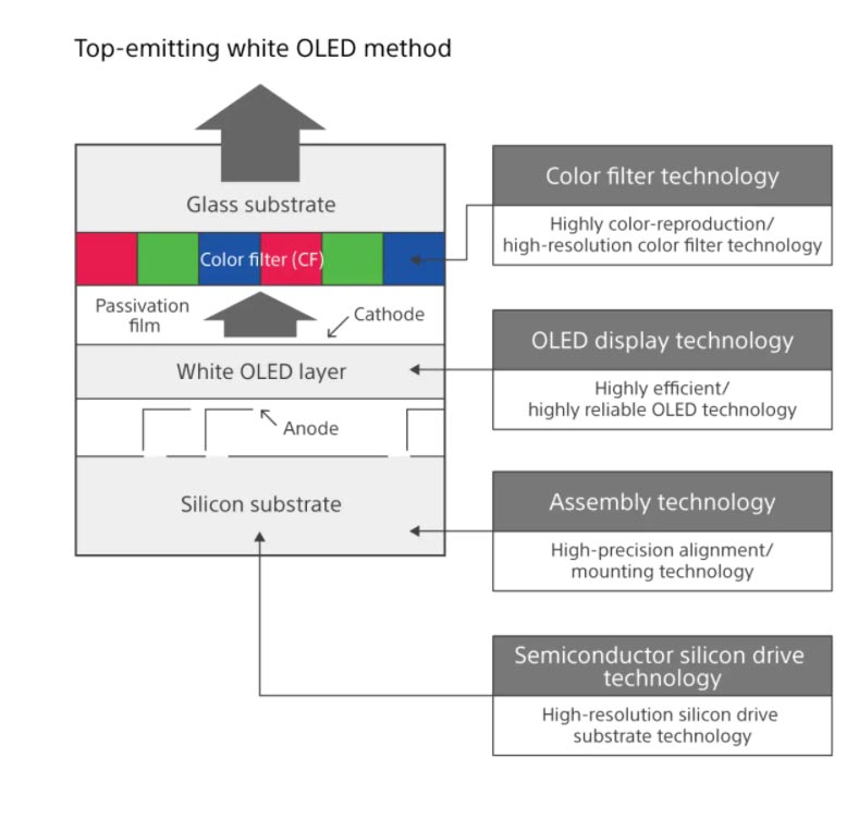 为了实现高图像质量,索尼正在使用包含彩色滤光片(CF)的Top-Emitting White OLED作为Micro-OLED显示器的组件。向上发光白色OLED的发光结构和所使用的技术如上图所示。