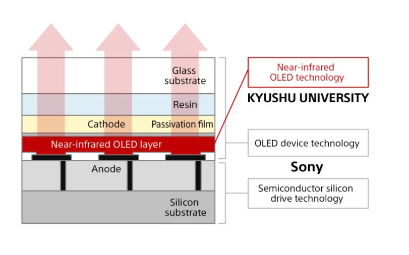 团队与正在研究下一代高性能发光材料的日本九州大学有机光子学和电子学研究中心合作。一开始,EQE一直停留在0.1%以下。然而,通过将索尼的Top-Emission技术与利用九州大学材料技术开发的新材料相融合,实现900nm波段近红外OLED的实用EQE成为了可能。