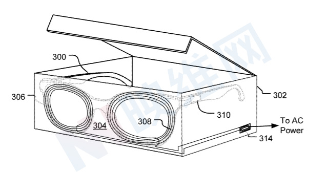 如图所示,当头显设备300位于无线充电盒302内时,头显设备300中的每个充电线圈都位于充电线圈306和308中相应一个的附近,使得由每对对齐充电线圈定义的环路所包围的区域之间存在至少一定的重叠。
