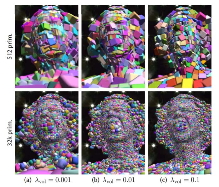 尽管初始化为众多体三维原语(尤其是面部)提供了合适的初始位置,但对于其他区域(如头发和肩部),初始化通常是错误的。为了解决这个问题,训练模型生成基本位置、方向和内容,以最佳匹配从多视图捕获系统捕获的图像。这个训练过程允许从任意角度制作出高质量的人物效果图。