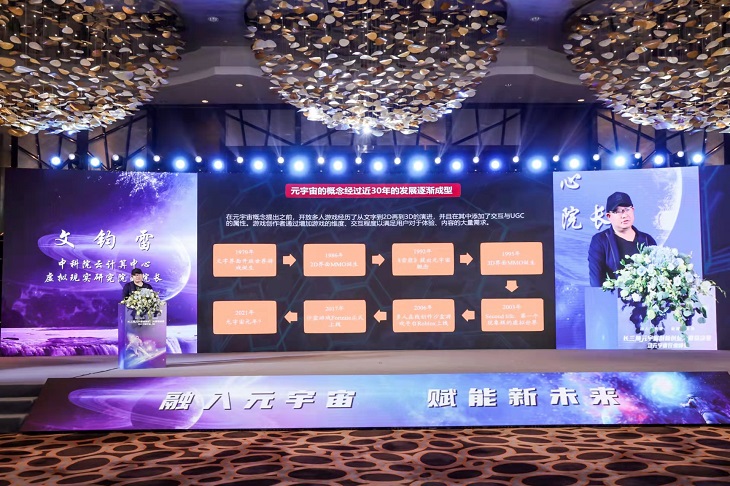 随后,中科院云计算中心虚拟现实研究院副院长文钧雷阐述了元宇宙近30年的发展过程,强调了元宇宙中的体验要素。文院长认为,元宇宙本质上是复合型的产业,也可以看作是是“VR+”的升级版本。在中端硬件的支持下,未来元宇宙产业终将爆发。