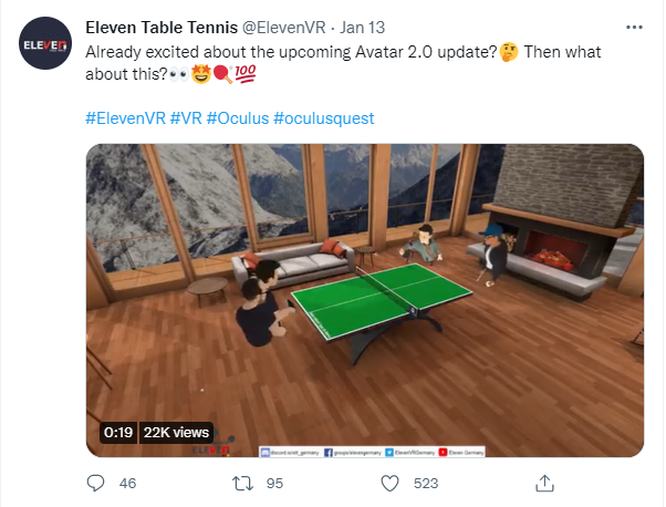 近日,VR乒乓球游戏《Eleven Table Tennis》宣布将支持最新的Meta Avatar 2.0上半身虚拟头像系统,将很快能够支持多人游戏,实现VR乒乓双打或是2V1比赛。