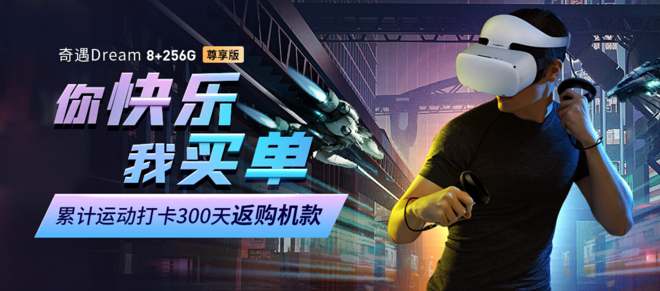 硬件方面,奇遇Dream尊享版这款预约超7万台,创下品类预售记录的产品采用了旗舰标配的高通XR2芯片、6DoF交互以及8+256G大内存。销售端则给出了诚意十足的免费送“20款价值近1200元的平台热门游戏+价值498元的奇遇VR影视年卡”的政策。不仅如此,官方还发起了“300天打卡享免单”活动,挑战成功后即可返还100%购机款。