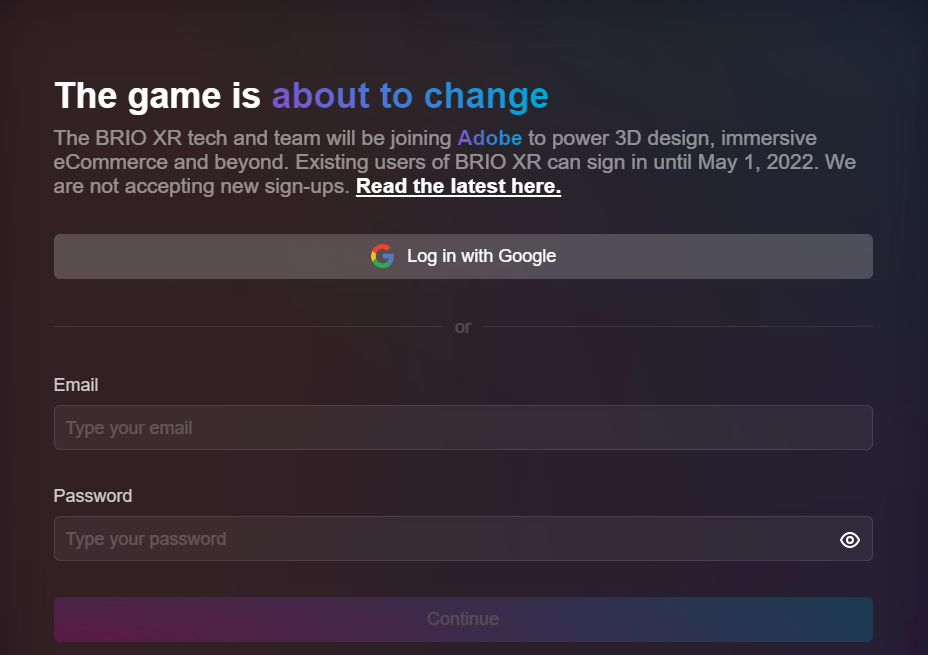 另外,这家公司的官网已撤下所有内容,只显示一个关于加入Adobe消息的页面:“BRIO XR的技术和人员将加入Adobe,以助推3D设计,沉浸式商务及其他。现有用户在2022年5月1日之前都可保持登录。我们将不再接受新注册用户。”