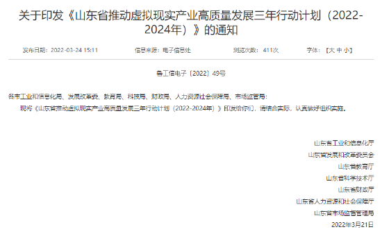 近日,山东省工业和信息化厅办公室印发《山东省推动虚拟现实产业高质量发展三年行动计划(2022-2024年)》的通知,该通知对虚拟现实产业发展现状逐级(全球、全国、山东省) 进行了分析总结,并对接下来三年,山东省在虚拟现实方向的发展给出了指导思想以及发展目标。