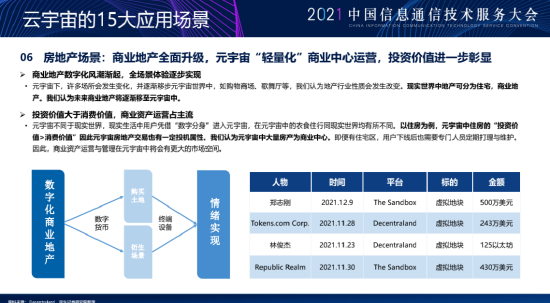第六个应用场景是房地产场景。作为整个现在二级市场板块最火的板块,未来的商业地产可能会逐步变成运营中心,就是元宇宙的轻量化运营中心,未来的商业地产我们可能很多都要进行改造和升级,因为我们每个人经常去逛街的这个动作可能逐步会减少,而在元宇宙体验感提升之后这些变化可能会更加明显。