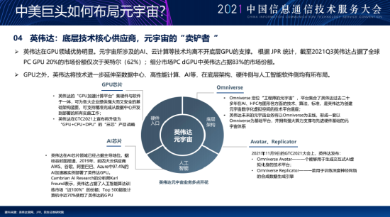 关于英伟达其实这里多说一点,整个元宇宙,或者说整个的游戏产业来看的话,是个几千亿的一个巨大市场,那你软件的提升,大家内容交互体验的提升,同样要带来硬件的全面的提升,这里面最重要的显示效果的提升、AI技术的提升等等,我经常开玩笑讲脸书喊的最响,英伟杂布局的最早最完善。