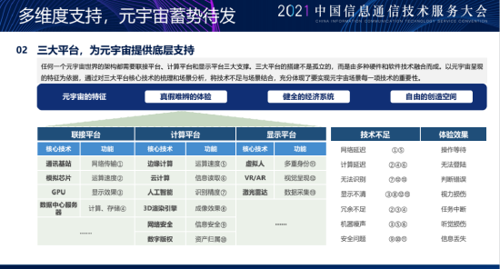 我总结的元宇宙的底层三大体验,包括体验感不断提升、经济系统、自由的创造空间,其中自由创造需要工具体验的提升、软硬件的配合,经济系统需要一套完备的比赛规则、经济规则,那这里边主要就是三大平台:连接平台、计算平台和显示平台。