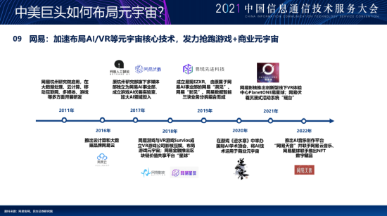 刚才几个公司,我估计大家听的比较多,这里就说一下网易这个公司,我觉得挺有特点的,我详细梳理过它整个的一个发展历程,它其实是典型的互联网公司,但是它一直是以内容为核心,而在元宇宙背景下,内容驱动的公司是最有机会走出来的。