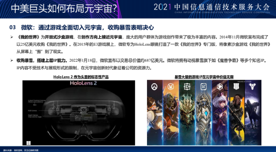 另外我再讲一点就是微软收购暴雪这个事情,其实很值得大家去思考,当时微软收购暴雪的时候我们跟国内很多部门也做了相应沟通,大家会觉得一个做办公平台的公司,过去几年才开始逐步做游戏,那是不是意味着游戏的定位会发生变化,即它不再是一个娱乐消耗时间的东西,它的最终目标就是建立一个虚拟世界呢?