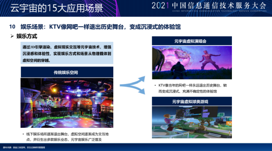 第十个场景是娱乐场景。我这里说了一句狠话,叫ktv像网吧一样逐步推出历史舞台,讲的是什么呢,现在唱歌里边的确定性太强了,我们希望元宇宙不停的去模拟虚拟世界,其实最主要的就是让他的不确定性增强,所以现在你会发现像密室逃脱等等这些为什么火爆,就是角色扮演这个原因,这是其中很大的不同。