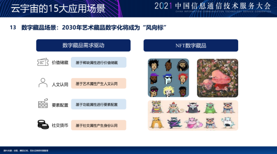 第十三个场景是数字藏品场景。大家想一个问题很有意思,什么是数字藏品呢?那就是我们在虚拟世界里边,很多人因为挖了比特币等等也很有钱,但是那里边也需要像现实一样,我们有相应的消费和特征,比如我们现在里面现实里大家带个爱马仕之类东西,或者开一辆豪车,表达咱们身份不一样,其实虚拟世界过去也有,比如说QQ里边的你的等级,你是三个太阳还是两颗星星,那现在我们叫抖音里你是60级大哥还是1级小白,你发现大家他也有个身份。那在整个虚拟世界里边,未来你的头像也好你的NFT也好,同样是做相应的一个身份的一个体验对吧?