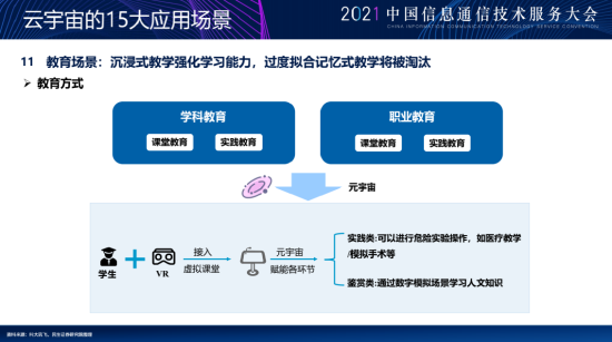 第十一个场景是教育场景。我们以前的教育,大家总说这个孩子聪不聪明,其实我的理解再把它细化一下,但在于这个孩子对于抽象逻辑,或者抽象画面的理解是否足够强。具体的食物比如说你说这是苹果这是梨大家都了解,那难的理解是什么呢?就是抽象的东西你能理解我不能理解,包括我们的历史、政治、数学等偏抽象的,那你把这些部分做相应的一个提升,最好的就是元宇宙,你把它进行相应的一个还原,让它看起来更具体,这个对他来讲很重要。