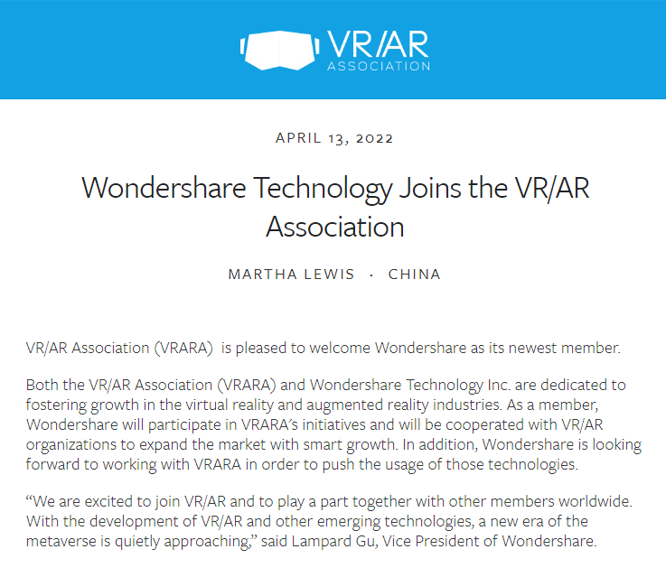 近日,世界VR/AR协会很高兴地宣布,万兴科技正式成为世界VR/AR协会的最新成员。