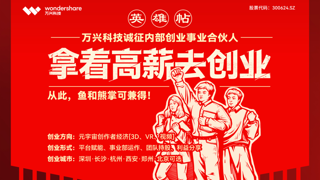 值得关注的是,为更好地面向未来聚力人才,万兴科技近日还广发“英雄帖”,推出“‘拿着高薪去创业’——创业3.0引才政策”,面向全球招募3D/VR/视频创意领域的内部创业事业合伙人,及3D算法工程师/动画设计/投资/产品策划等精英,入驻深圳、长沙、杭州、西安、郑州、北京等城市的万兴运营中心,加速为创作者赋能。