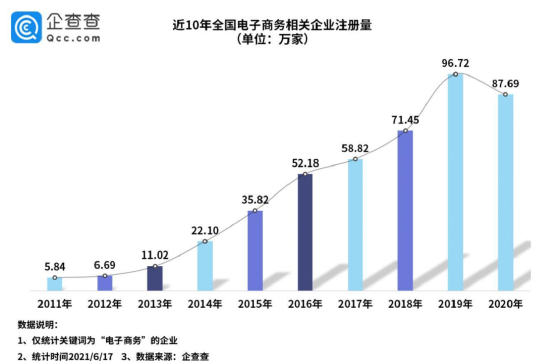 企查查数据显示, 2011-2019 年全国电商相关企业注册量逐年攀升, 2011 年仅 5.84 万家,至 2019 年注册量已达 96.72 万家, 直逼“百万大军” 的规模, 同比增长 35%。2020 年略有下降, 达 87.69 万家, 同比下降 9%。截至目前(6 月 17 日) 2021 年共新增 50.38 万家。