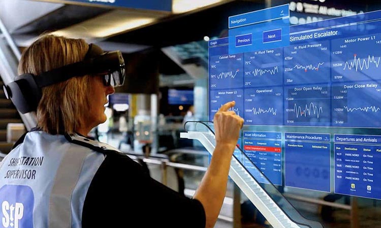 如上图所示,铁路工作人员可以利用直接显示在视场的数字信息来确保线路的正常运营,比如说电梯。这种数字状态监测系统允许团队能够更有效地判断线路基础设施的维护情况。